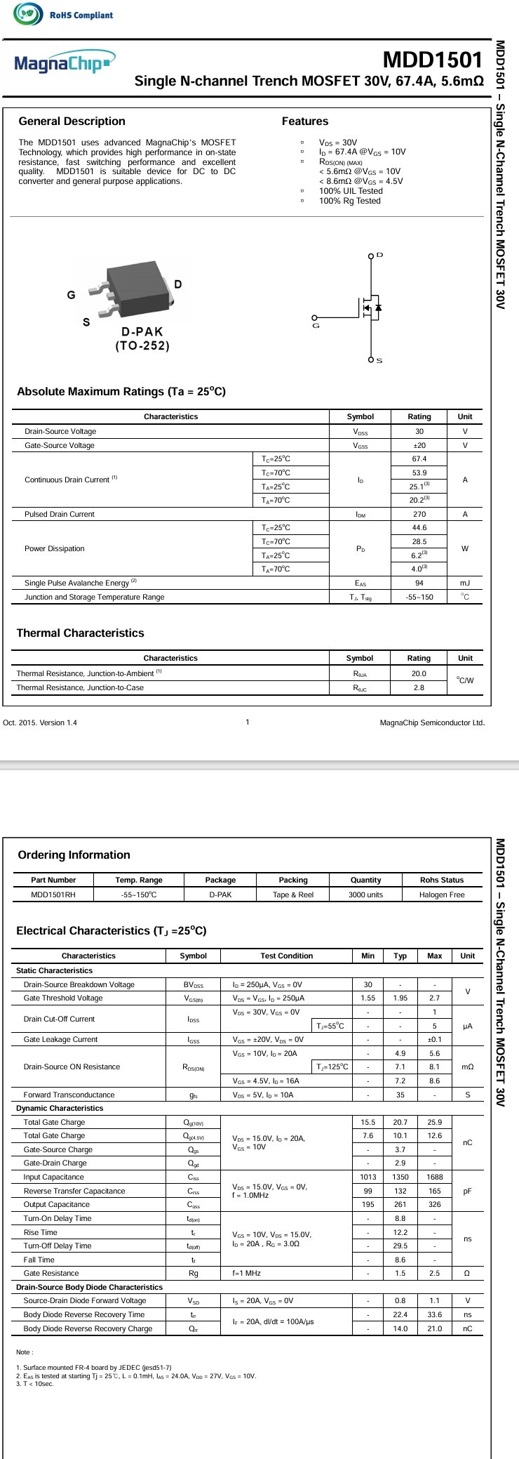 MDD1501RH TRANS MOSFET N-CH 30V 25.1A 3-PİN(2+TAB) DPAK T/R TO-252