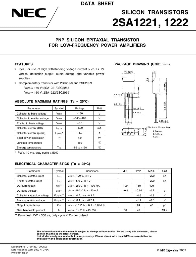 2SA1221- PNP 160V-500MA SILICON EPITAXIAL TRANSISTOR FOR LOW-FREQUENCY POWER AMPLIFIERS