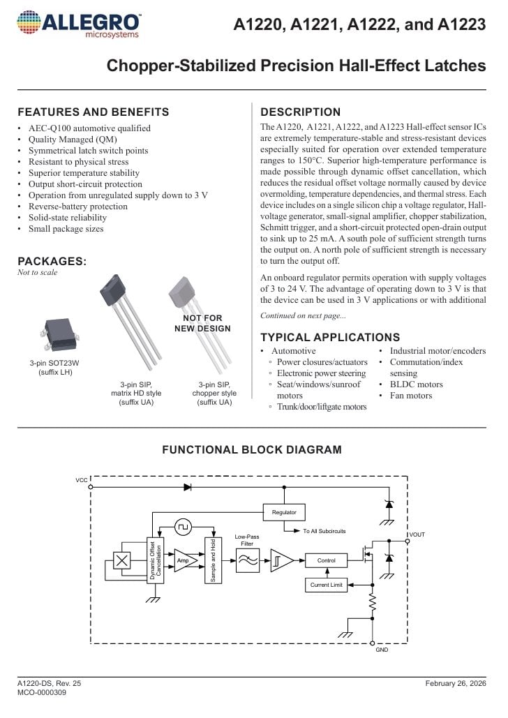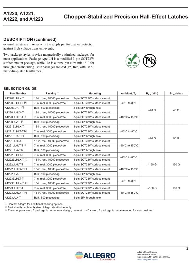 A1221LUA-T 3-SSIP Chopper-Stabilized Precision Hall-Effect Latches