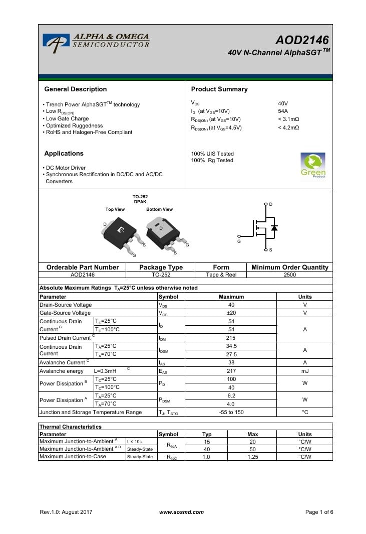 AOD2146 54A 40V 100W N-Channel MOSFET TO-252 (DPAK)