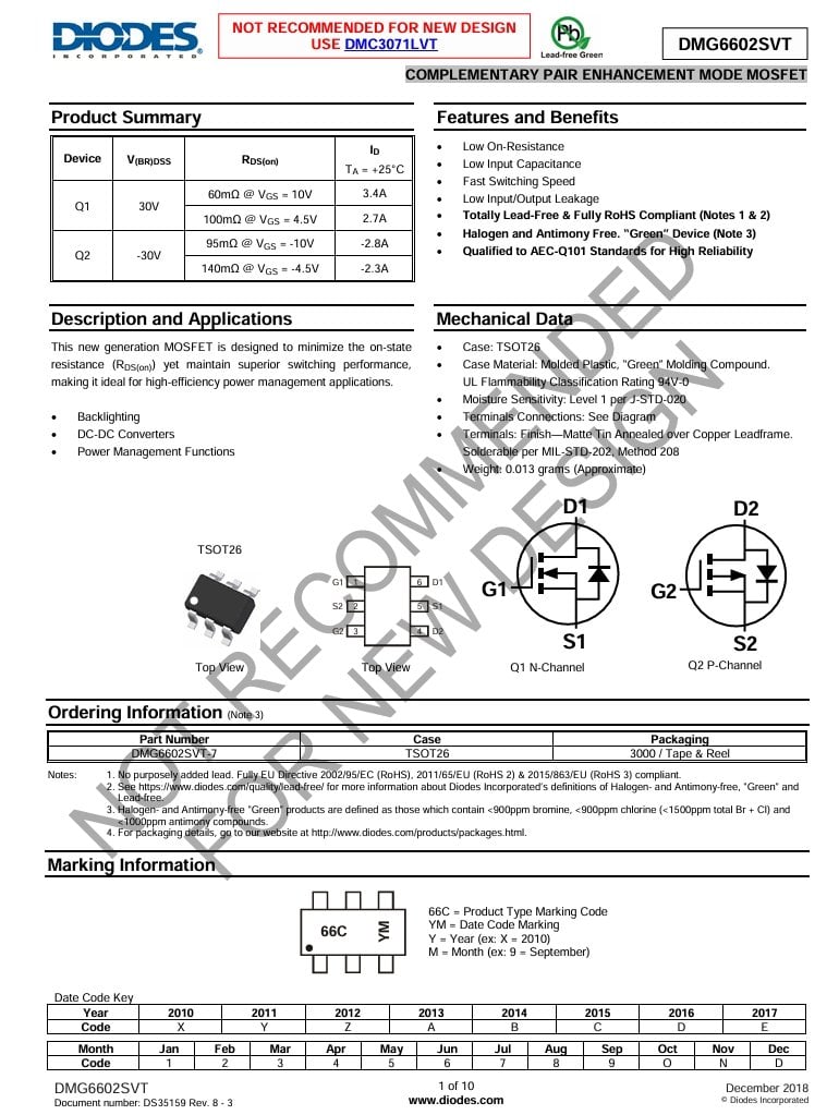 DMG6602SVT-7 TSOT-26-6 2.8 A, 3.4 A -30V N-Channel, P-Channel