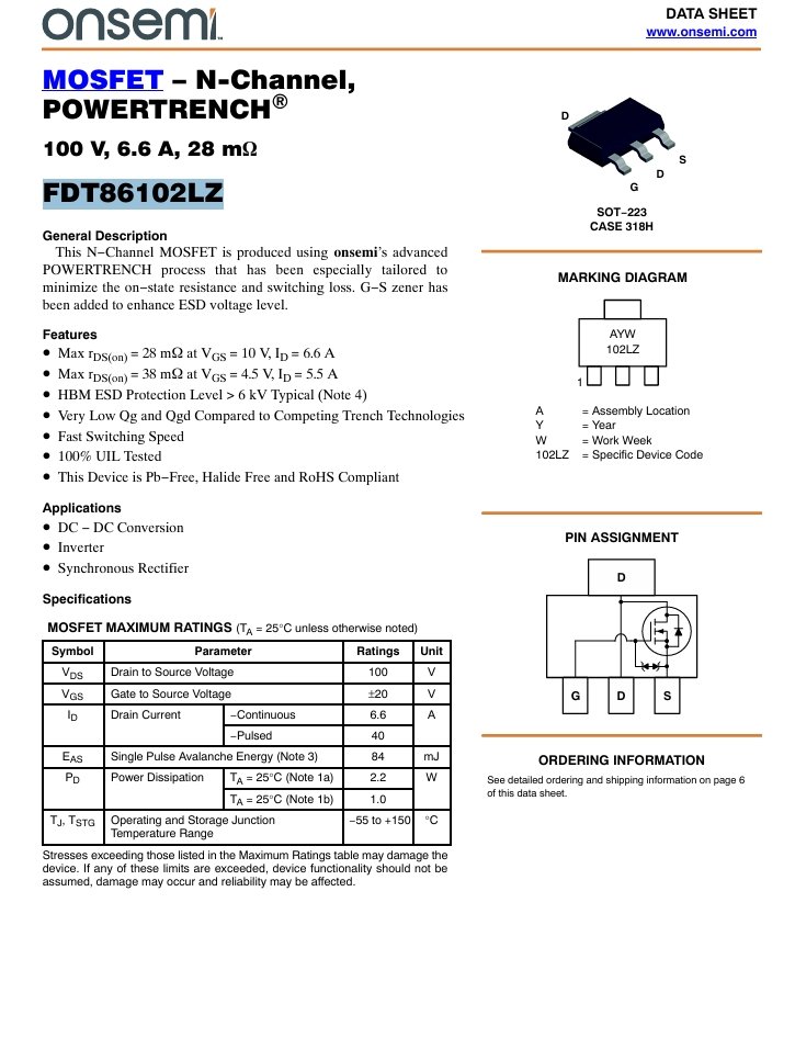 FDT86102LZ SOT-223 MOSFET – N-CHANNEL, POWERTRENCH 100 V, 6.6 A, 28 MEGA-OHM