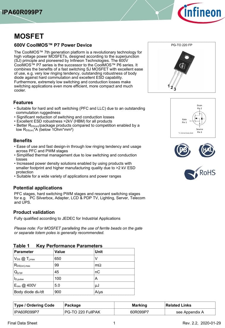 IPA60R099P7 TO-220F 100A-650V N-CHANNEL MOSFET