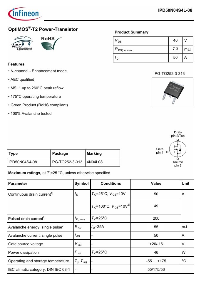 IPD50N04S4L-08 TO-252 (DPAK) 50A 40V N-CHANNEL MOSFET