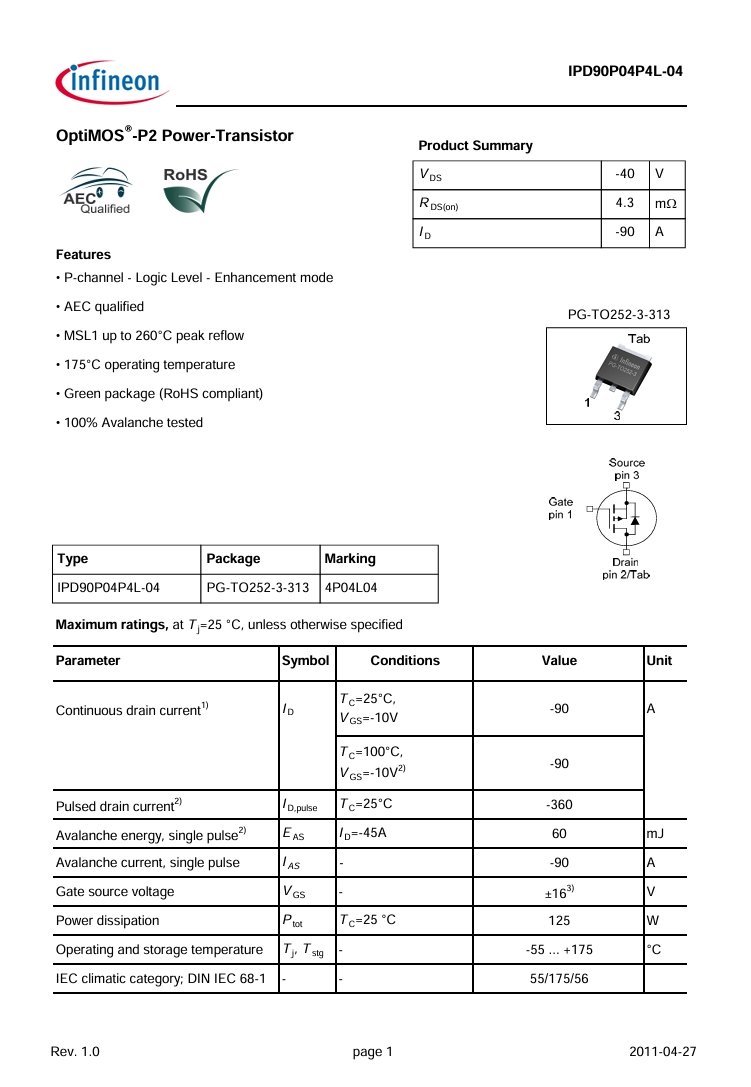 IPD90P04L-04 TO-252 90A-40V LOGIC P-CHANNEL MOSFET