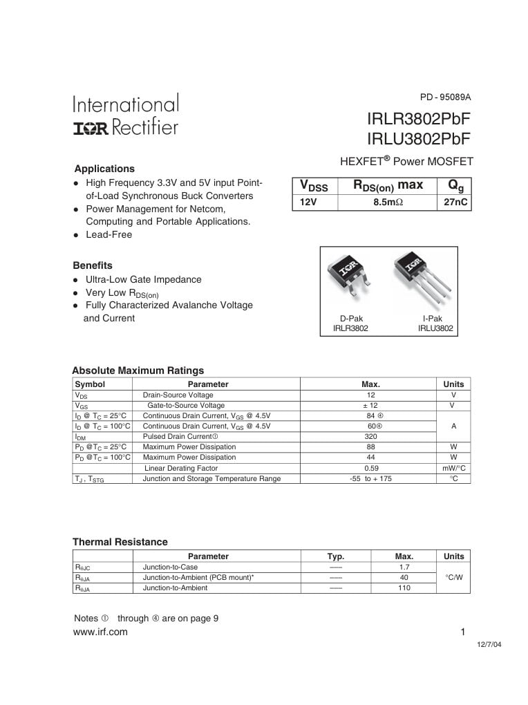 IRLR3802TRPBF TO-252 84V-12V N-CHANNEL HEXFET POWER MOSFET