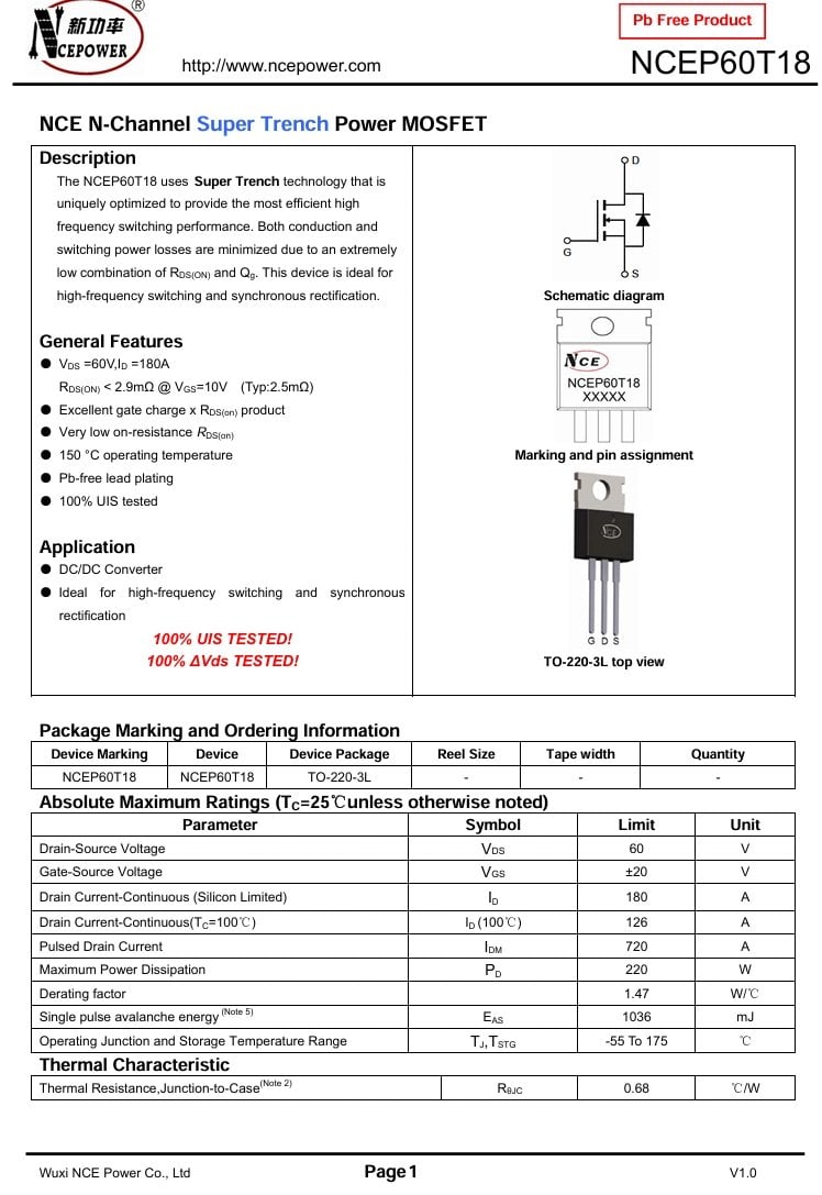 NCEP60T18 TO-220-3 180A-60V N-CHANNEL SUPER TRENCH POWER MOSFET