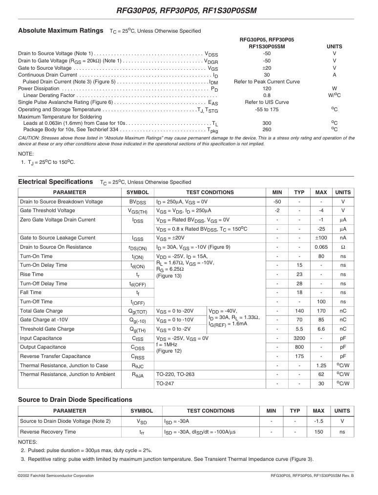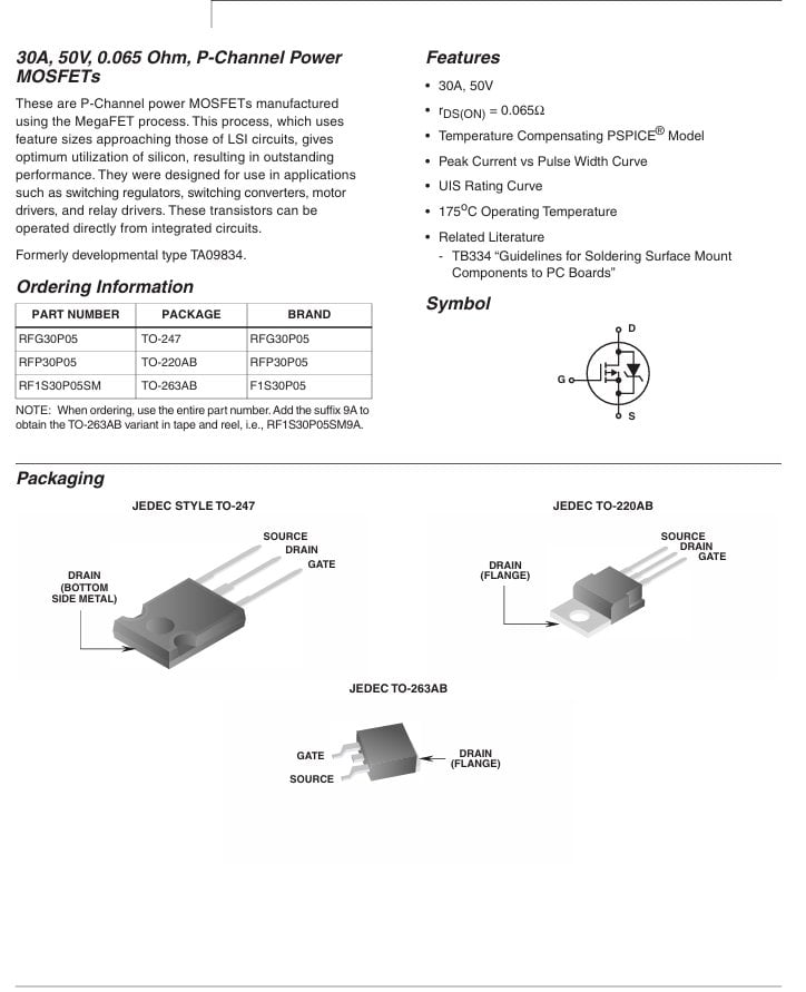 RFP30P05 TO-220 30A, 50V, 0.065 OHM, P-CHANNEL POWER MOSFETS