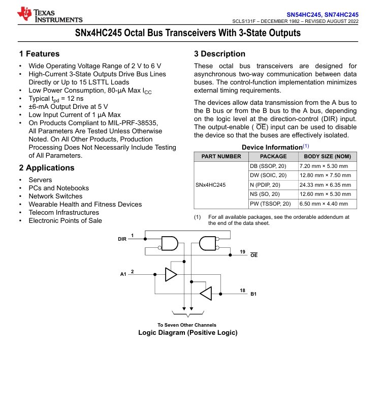 SN74HC245NSR SOIC-20 BUS TRANSCEIVER LOGIC IC