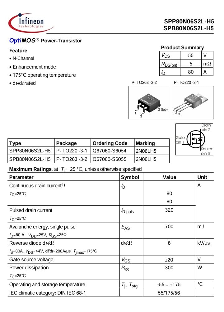 SPB80N06S2L-H5 TO-263-3 80A -55V N-CHANNEL MOSFET