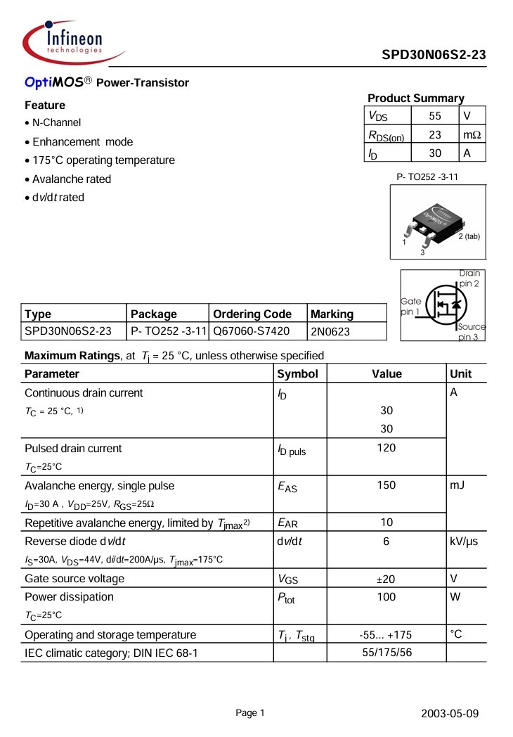 SPD30N06S2L-23 TO-252 30A 55V N-CHANNEL MOSFET