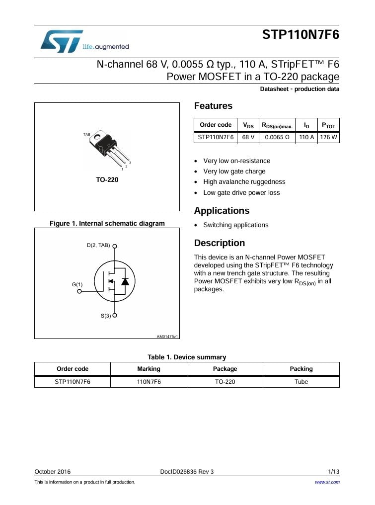 STP110N7F6 TO-220-3 110A 68V N-CHANNEL MOSFET