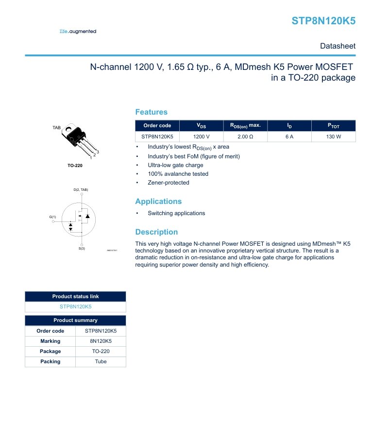 STP8N120K5 N-CHANNEL 1200 V, 1.65 Ω TYP., 6 A, MDMESH K5 POWER MOSFET İN A TO-220 PACKAGE