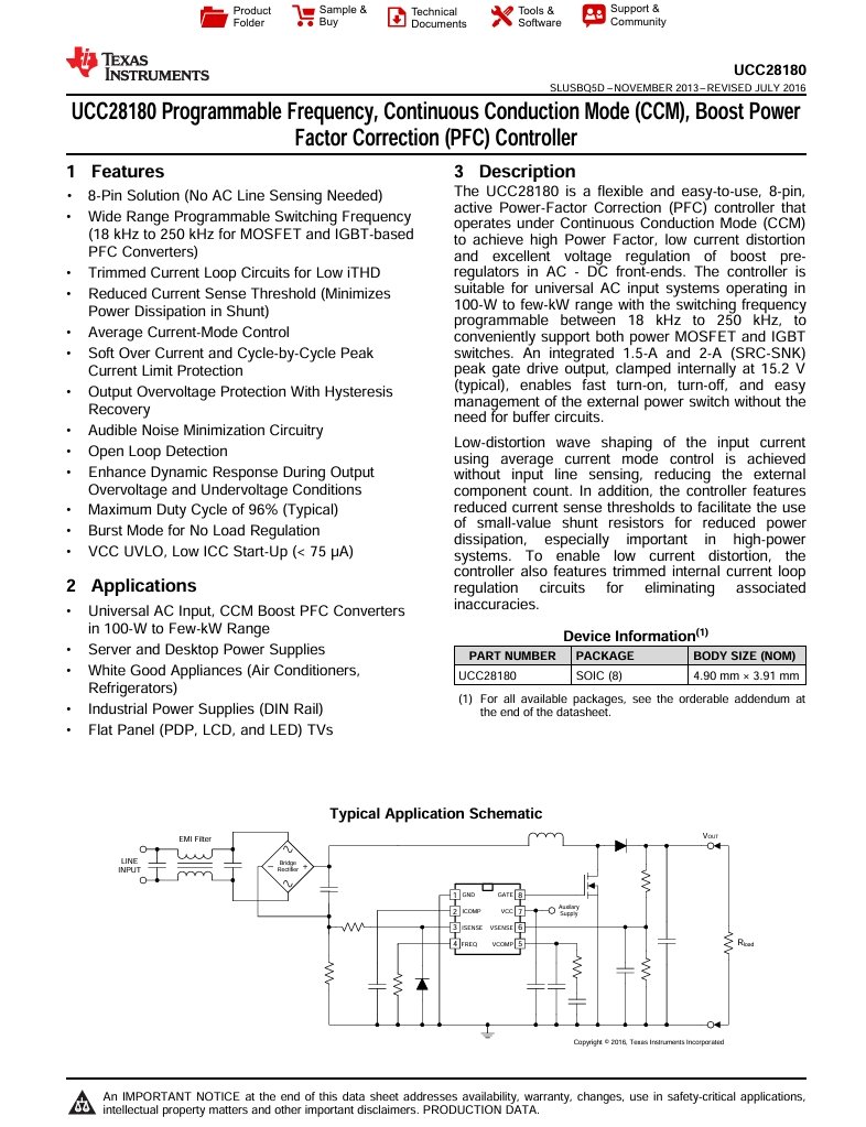 UCC28180 SOIC-8 PROGRAMMABLE FREQUENCY, CONTİNUOUS CONDUCTİON MODE (CCM), BOOST POWER FACTOR CORRECTİON (PFC) CONTROLLER